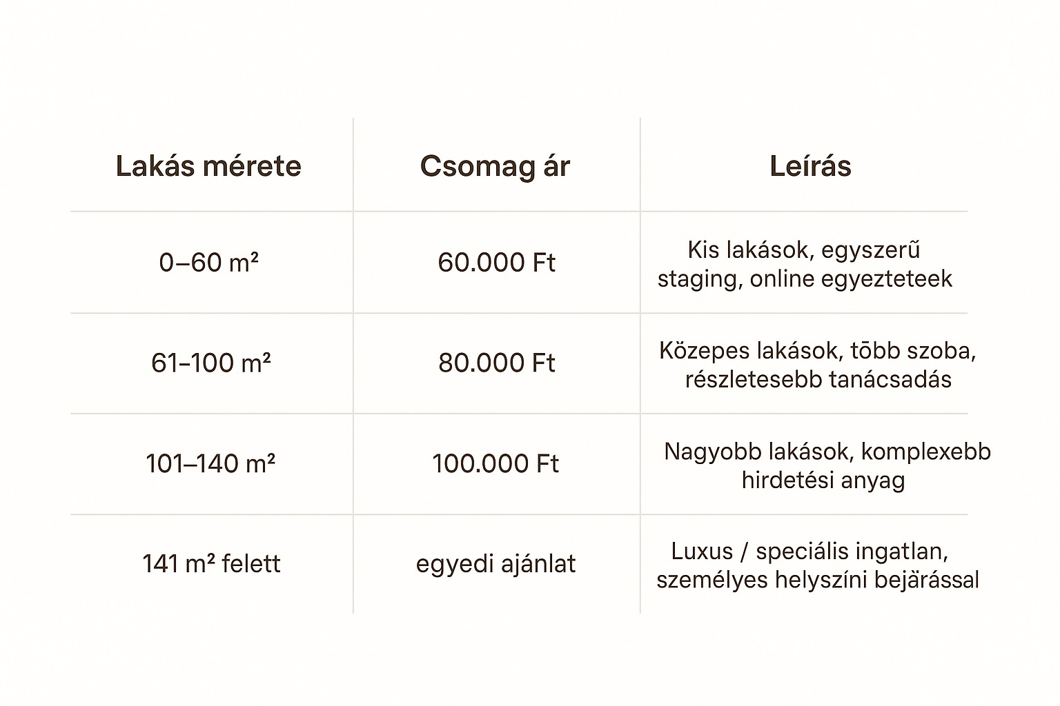 Az alábbi sávos árak segítenek, hogy minden ingatlan méretéhez igazodó, átlátható díjazást kínálhassak.